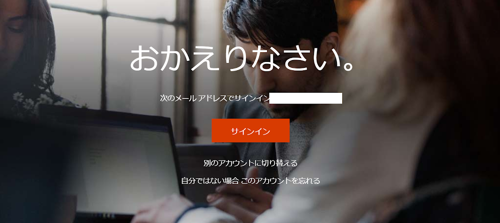 Microsoft Office のサイトへアクセスします。メアドを入力し、[サインイン]をクリックします。